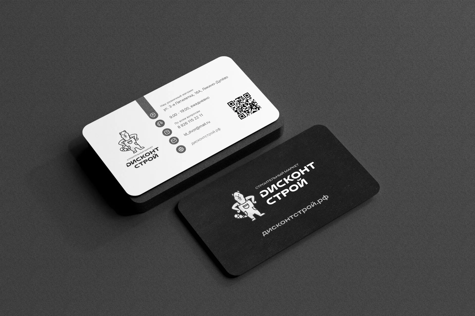 Вместе с логотипом, мы предложили заказчику сразу визуализацию логотипа в возможном дизайне на фирменный визитках магазина «Дисконт Строй» в Дмитровске.